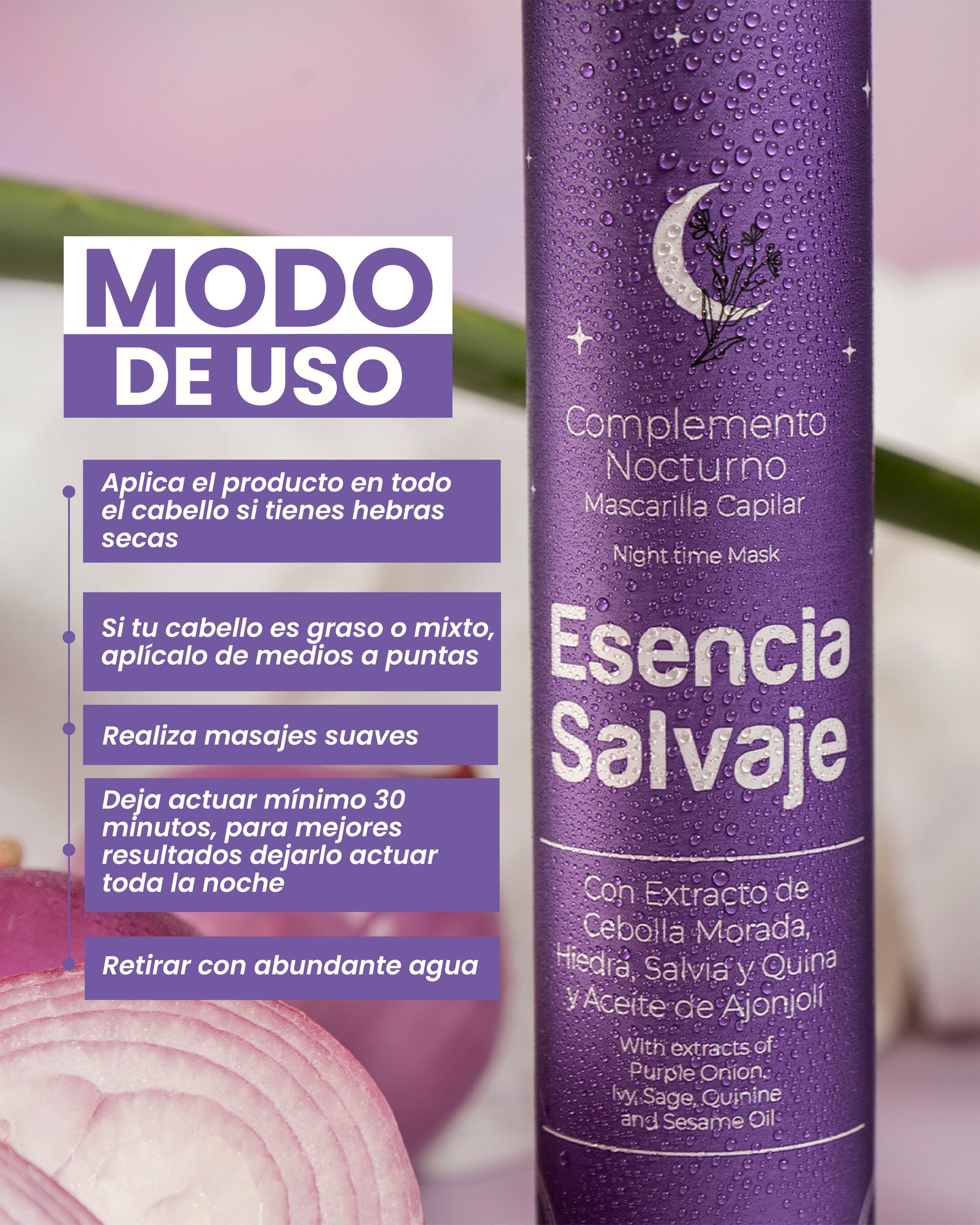 Esta Mascarilla Capilar para uso nocturno, estimula el crecimiento del cabello,rico en atioxidantes,mantiene el cuero cabelludo en buenas condiciones,vigoriza la hebra capilar,brinda hidratacion,acondiciona el cabello,facilidad para peinar,aporta brillo,suavidad