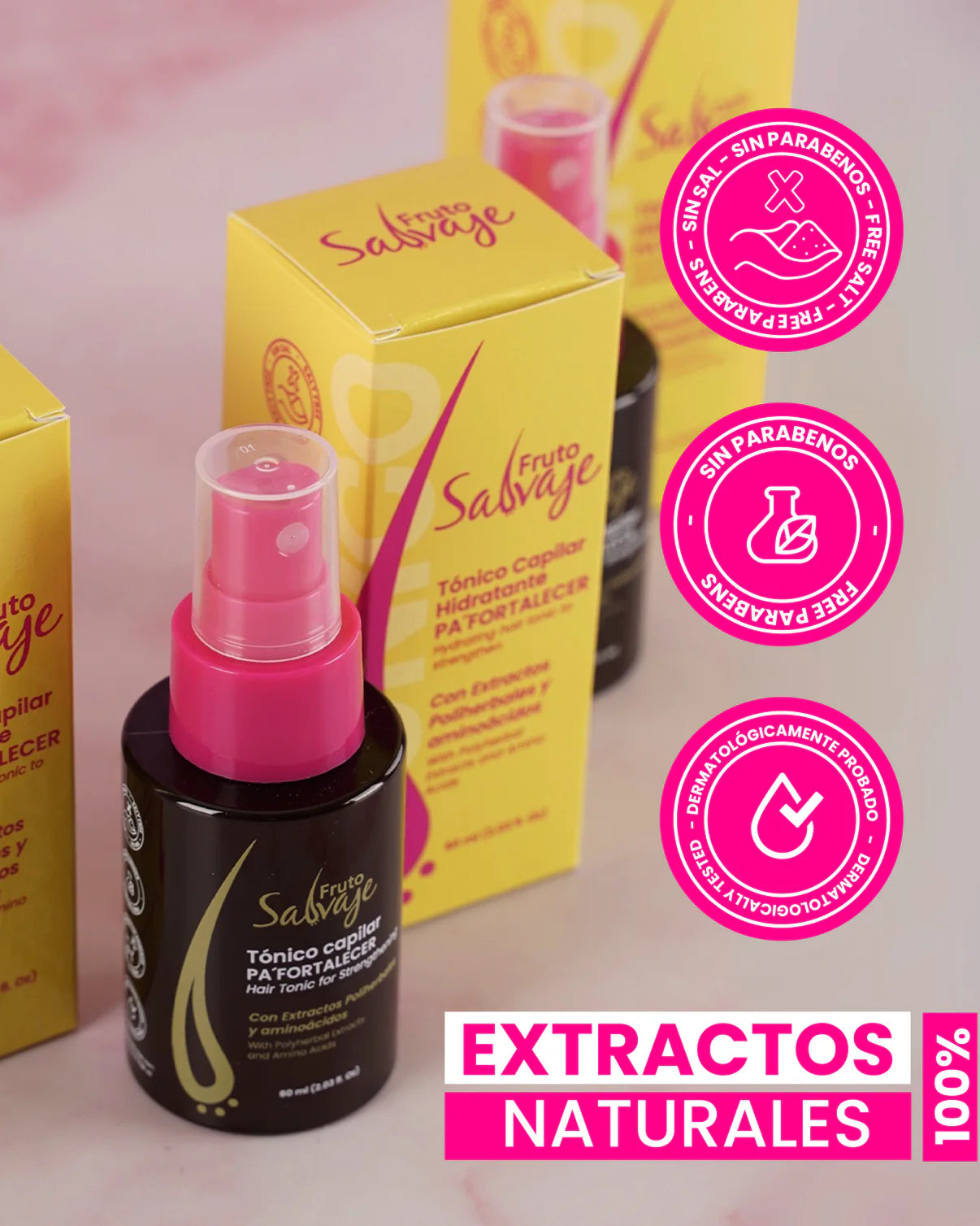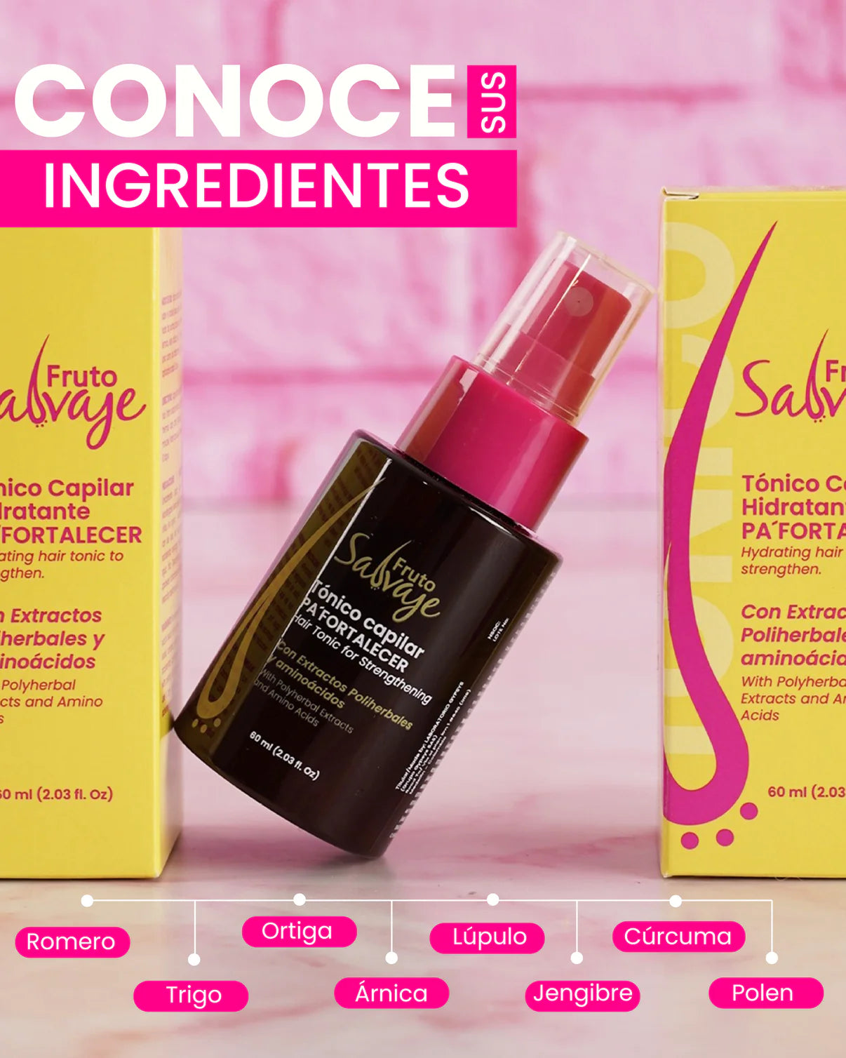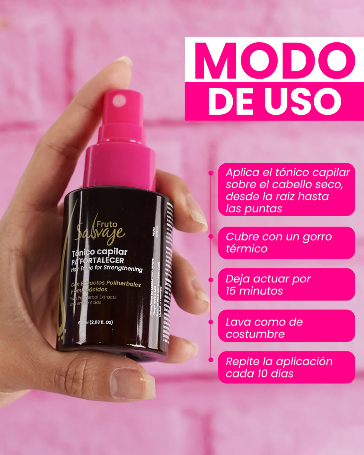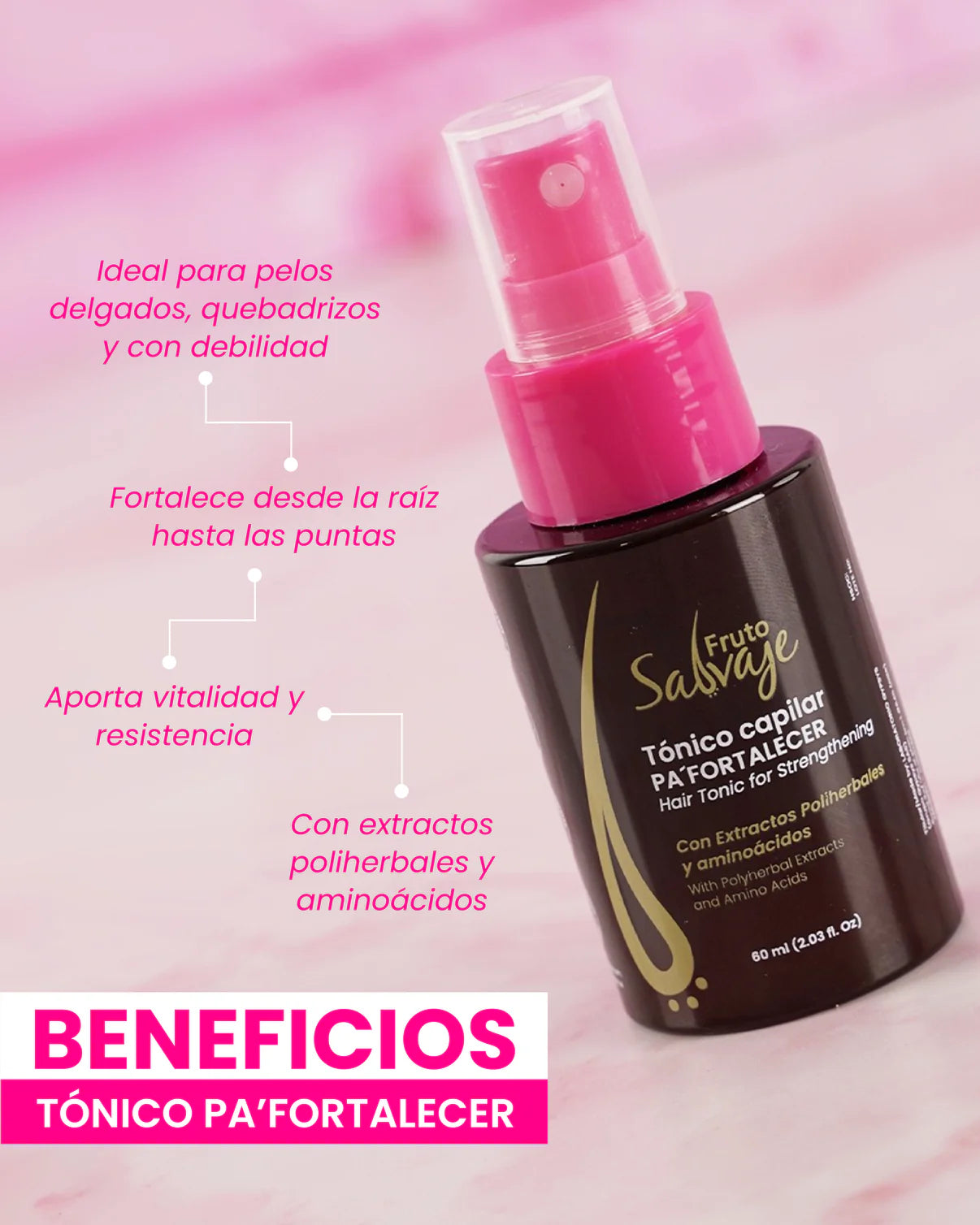 Tónico Capilar Pa FORTALECER Fruto Salvaje con aminoácidos extraídos de la caña de azúcar, fortalece y reestructura la cutícula capilar, ayuda a promover la producción de queratina y colágeno.